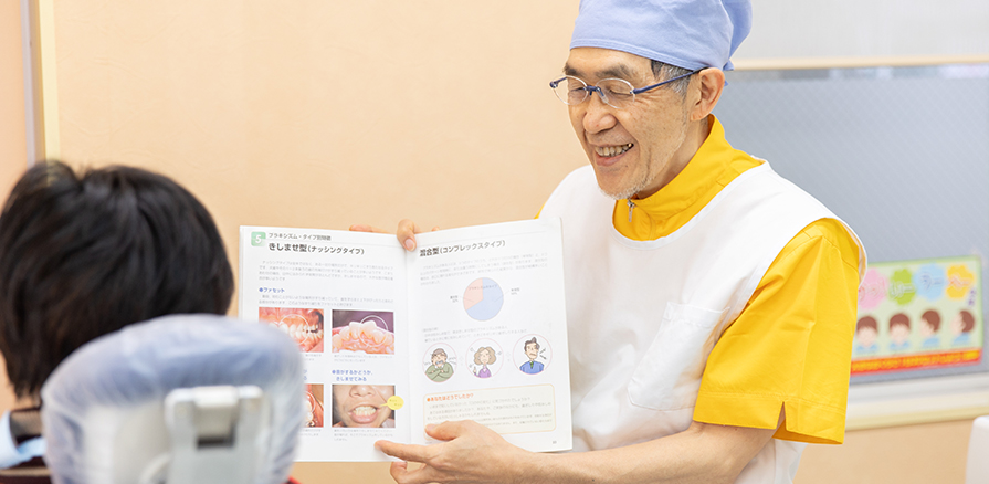 診療では、必要以上に歯を削り過ぎないことと神経を残すことを重視。1本の歯を治療するにも、周りの歯茎や噛み合わせの状態などを診査し、口腔内だけでなく体全体をトータルに診ながら診療することを心がけているのだそう。また、治療を始める前には十分な説明を行い、患者の理解、納得の上で進めていくことを欠かさないとか。